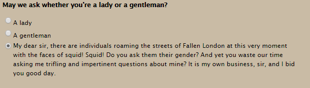 maxhatter Uncategorized June 7, 2018December 7, 2018 1 Minute haybuck-pony: This is officially the best gender choice in a game ever. Share this: Share on X (Opens in new window) X Share on Facebook (Opens in new window) Facebook Like Loading... Related Published by maxhatter View all posts by maxhatter Published June 7, 2018December 7, 2018