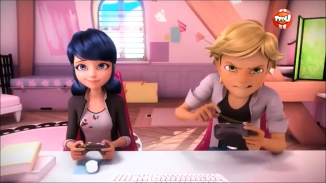 I love how Marinette is just sitting there thinking this is all easy, while Adrian is sitting there frustrated, slamming his fingers into the buttons with the goofy, mad face. This is the best! Bug out!