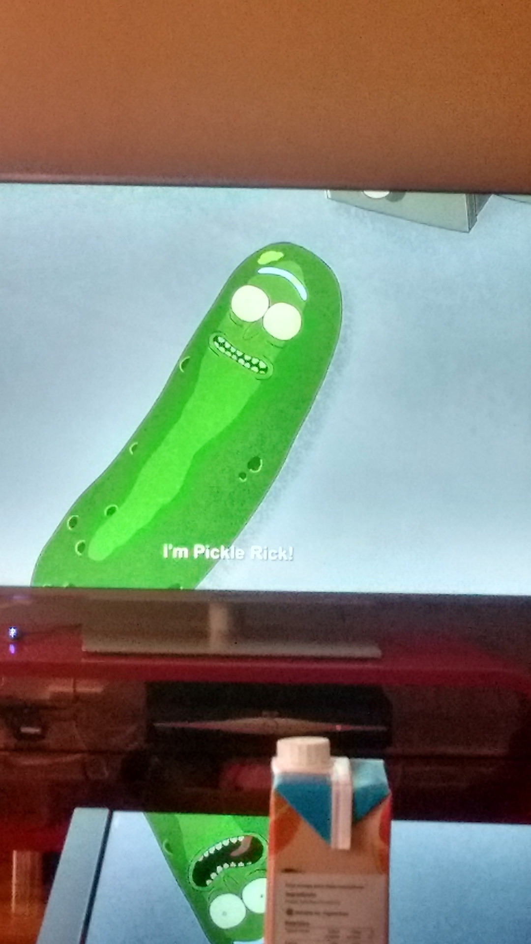 i took a pic of me watching the pickle rick episode to piss people off but like somehow i managed to take the pic so that the frame on the tv was…. a different frame to the reflection on the desk?