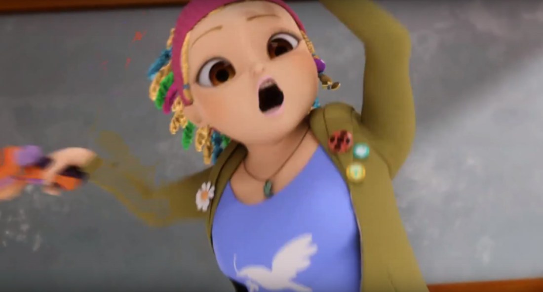 shes scared but also a part of her jacket sleeve is leaving her. maybe thats why shes scared. the ghosts are stealing from her