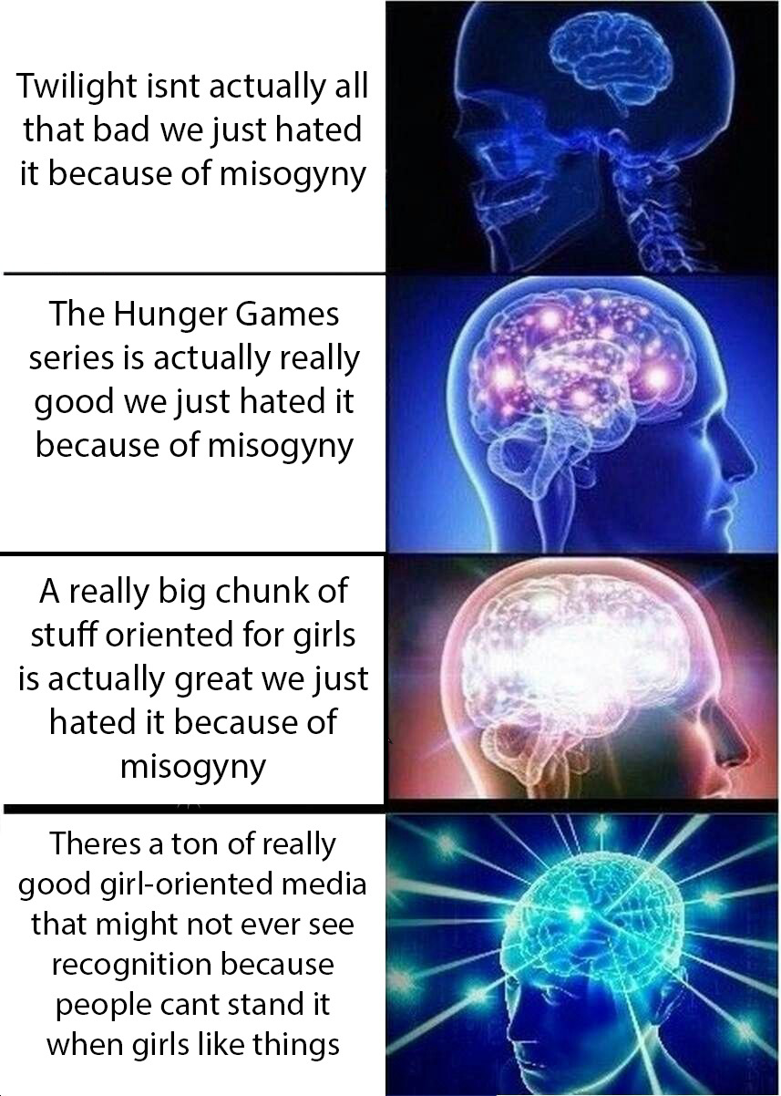 As someone that lived through the height of Twilight’s popularity (and hatedom), I can confidently say that most of the criticism revolving around Twilight was indeed because Edward was an abusive dick (and apparently checks most of the boxes for what constitutes as an abusive relationship), but it was okay because he was only doing it because he loved her. That was literally one of the biggest criticism of the series and I can’t believe that people honestly think that no one was talking about that. I wish I could find this Twilight hate site I visited a long time ago that made several points about Edward’s (and Jacob’s, I think) creepy behavior as to why the books were a piece of crap, not to mention the aforementioned creepy relationship with Jacob and Reneseme. Hell, there was a pretty popular meme floating around that went something like “Harry Potter taught me to be brave and stand up for what’s right. Twilight taught me how important it was to have a boyfriend”.